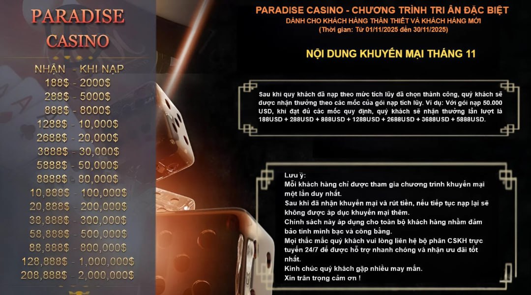 THÔNG BÁO : Số tài khoản ngân hàng trên nền tảng có thể thay đổi bất cứ lúc nào. Để đảm bảo giao dịch nạp tiền được chính xác và an toàn, quý khách vui lòng liên hệ bộ phận CSKH trực tuyến để xác nhận số tài khoản nhận trước mỗi lần chuyển khoản. Rất mong quý khách thông cảm và hợp tác! Chúc quý khách luôn hạnh phúc và gặt hái nhiều thành công!Trân trọng, [Paradise Casino Walkerhill]